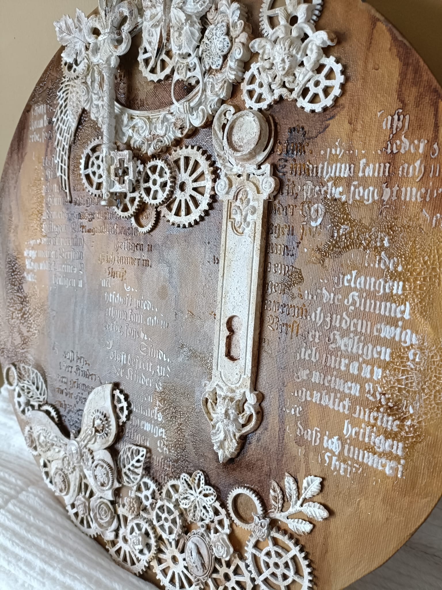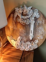 A handmade canvas with a 3D collage of cogs and gears, lock and key and butterflies with engaging textured.