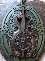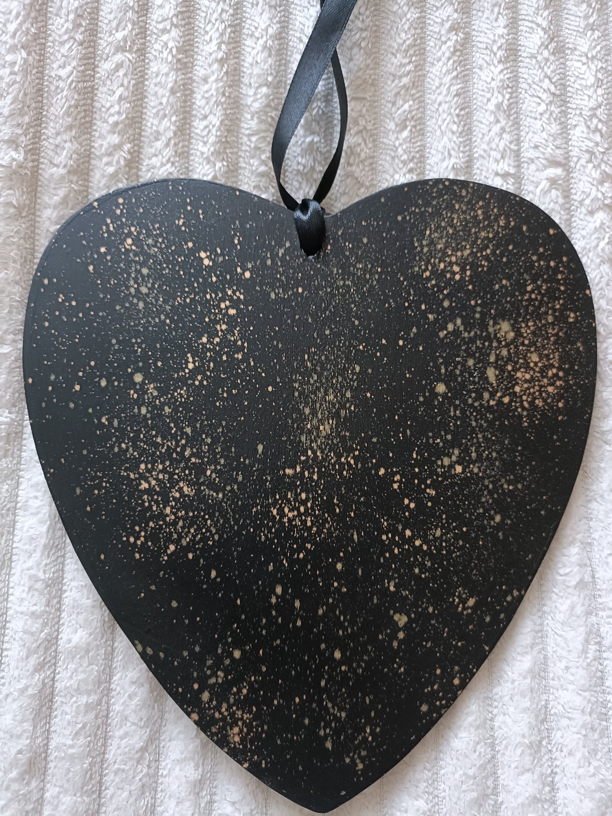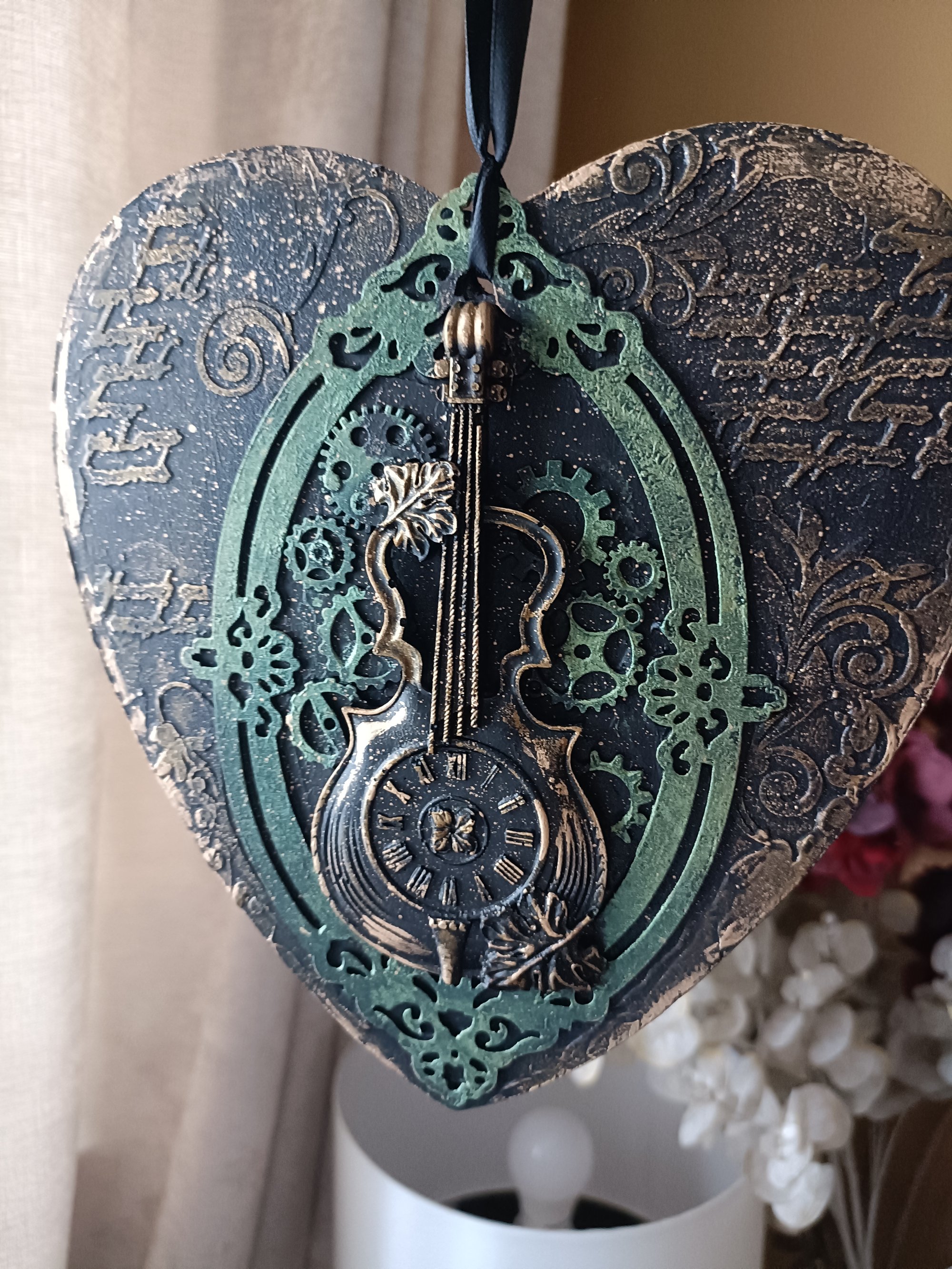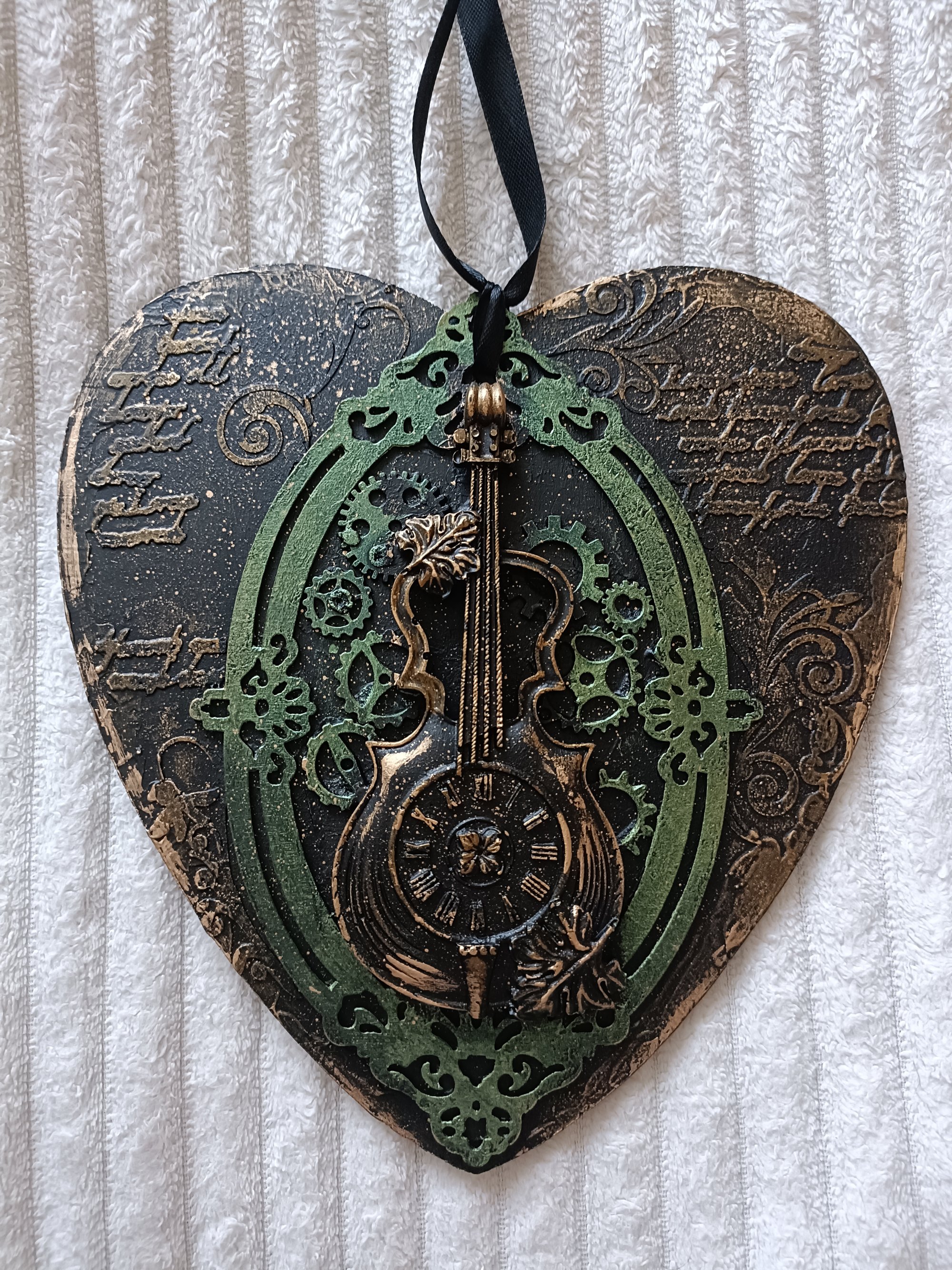 A beautiful handmade wooden heart shaped mixed media wall hanging plaque with a violin