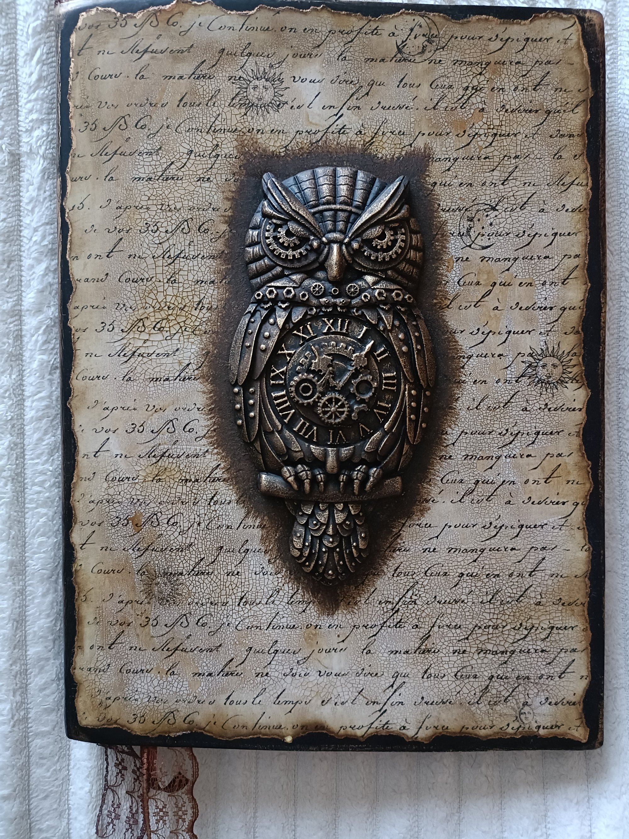 A beautiful handmade journal with an owl on the front cover with a steampunk influence.
