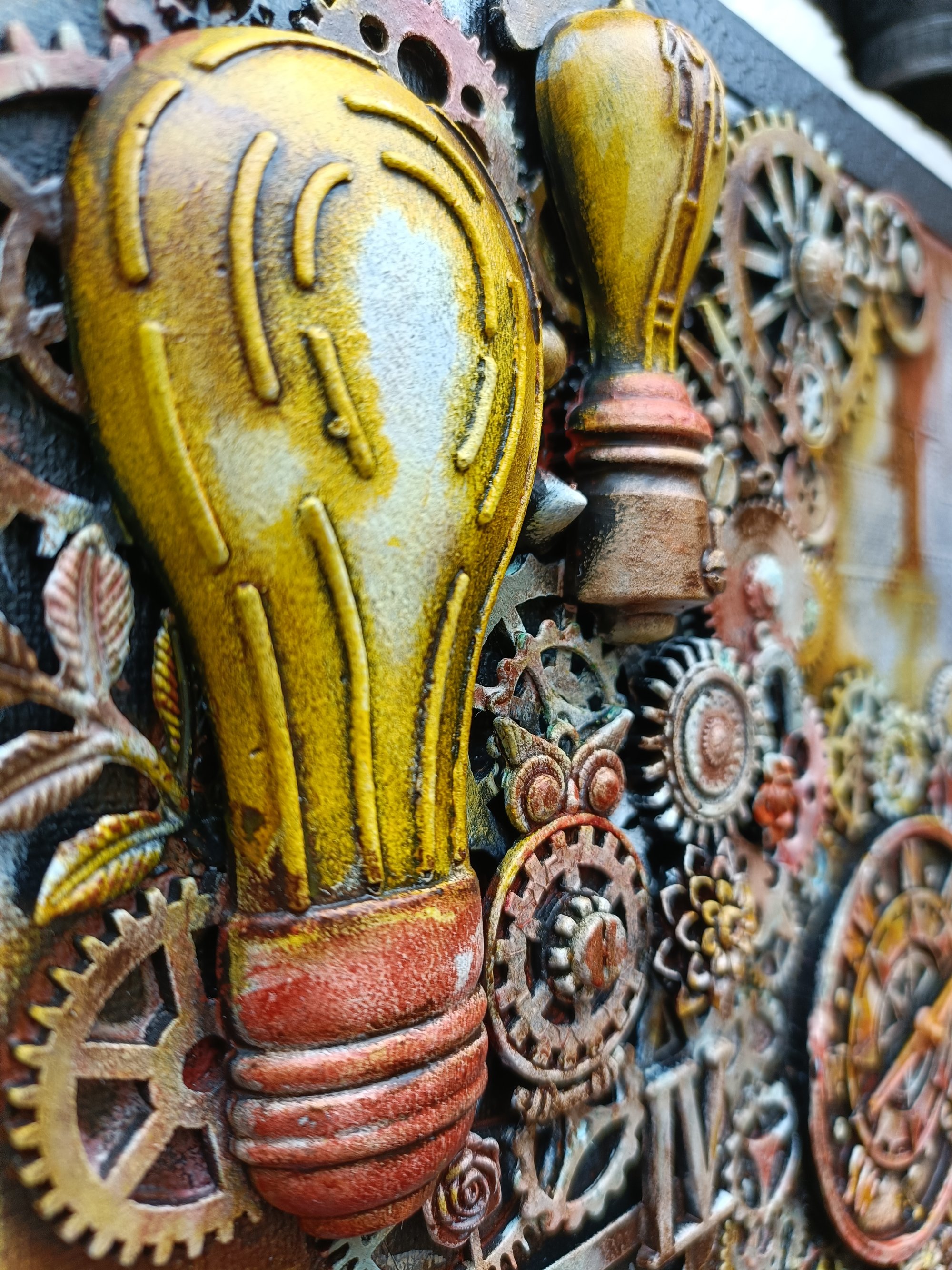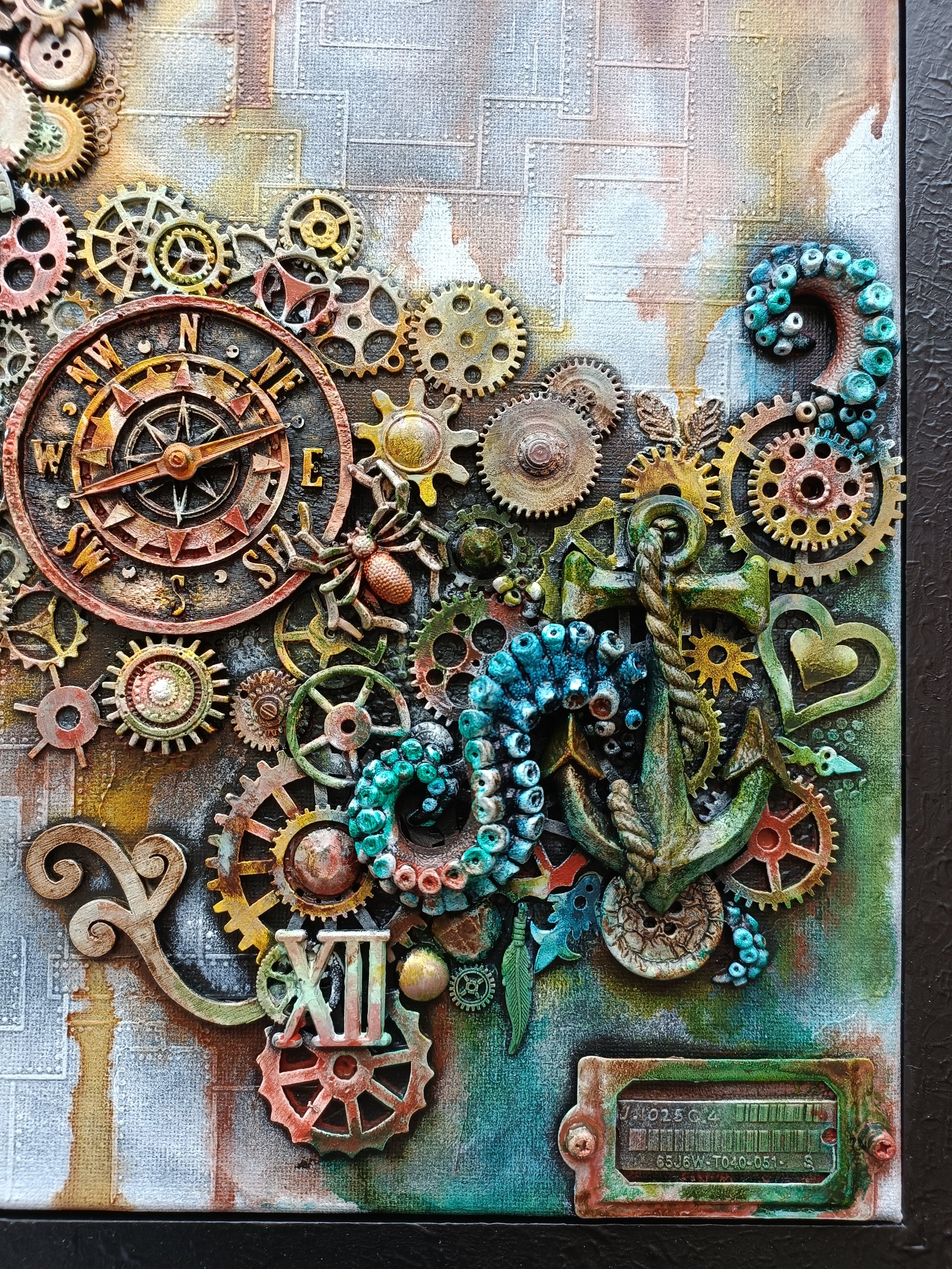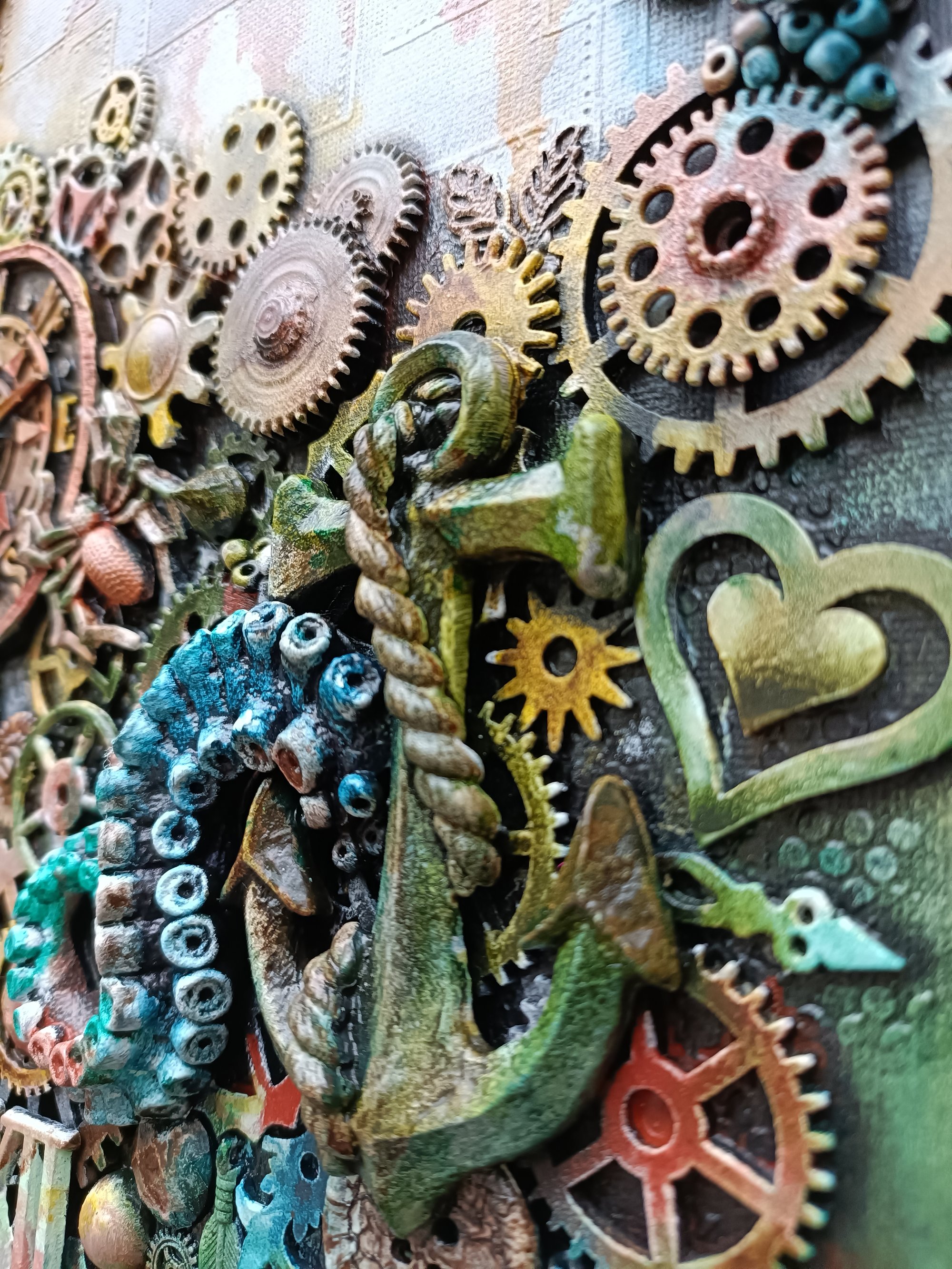 A beautiful handcrafted canvas in a 3D steampunk inspired style. From light to the depths of the sea. This is a 30x30 canvas, framed and ready to hang. Overall size is 33x33cm (13''x13'').